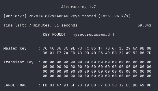 And you can see, after testing just over 20 million passwords in 18 minutes, it finally found one that matched. The password for my SSID is mysecurepassword.